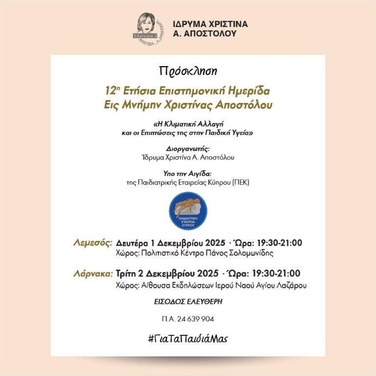 Με μεγάλη επιτυχία πραγματοποιήθηκε σε Λεμεσό και Λάρνακα η 12η επιστημονική ημερίδα εις μνήμη της Χριστίνας Αποστόλου από το Ίδρυμα Χριστίνα Αποστόλου.